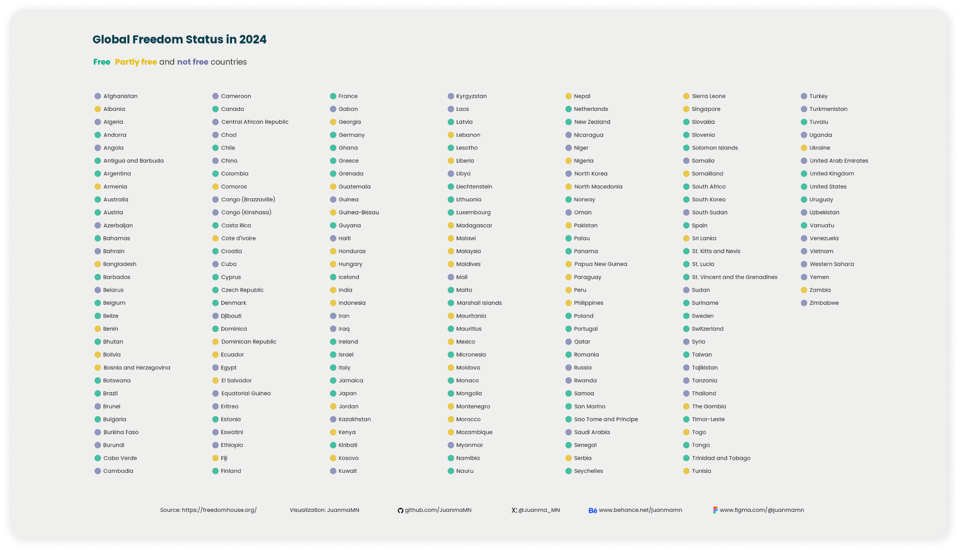 The below graph provides an analysis of free, partly free, not free countries in the world in 2024.